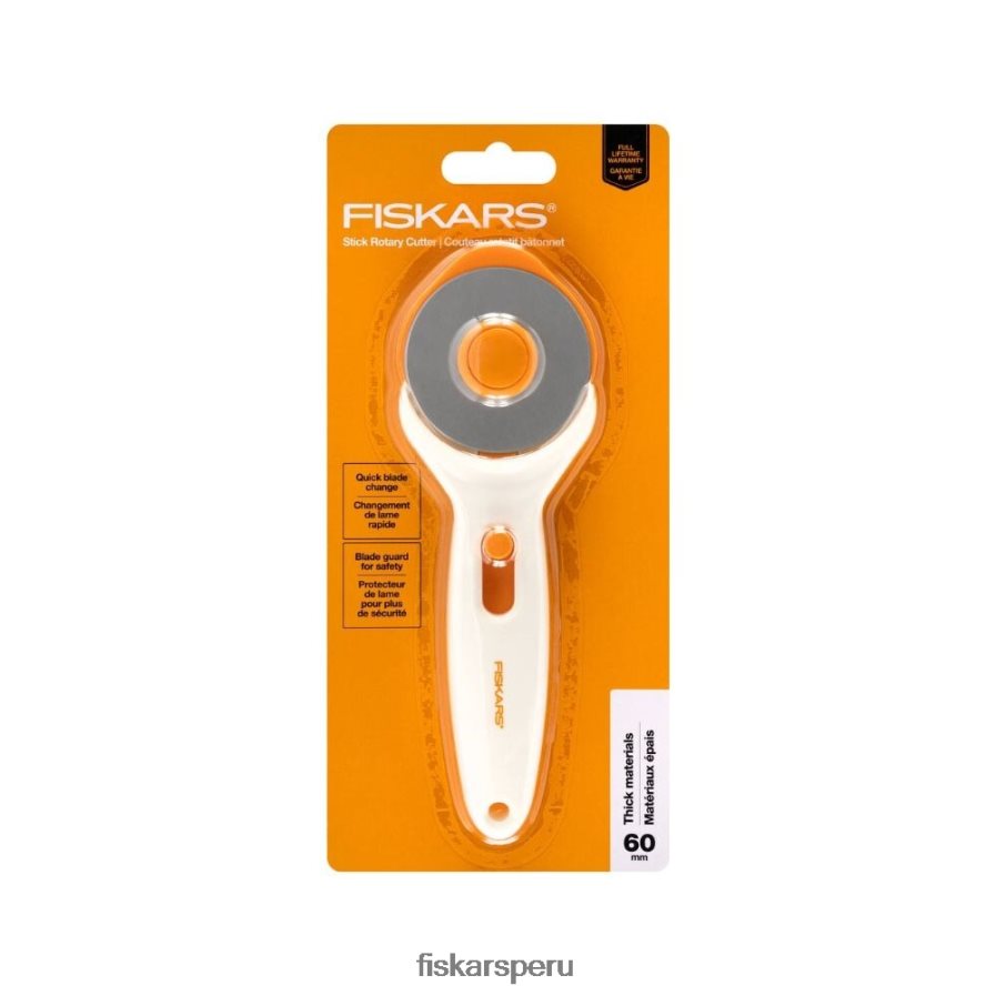 - cortador giratorio de barra fiskars (60 mm) es ideal para cortes suaves en guata y telas gruesas, como lona, mezclilla y cuero