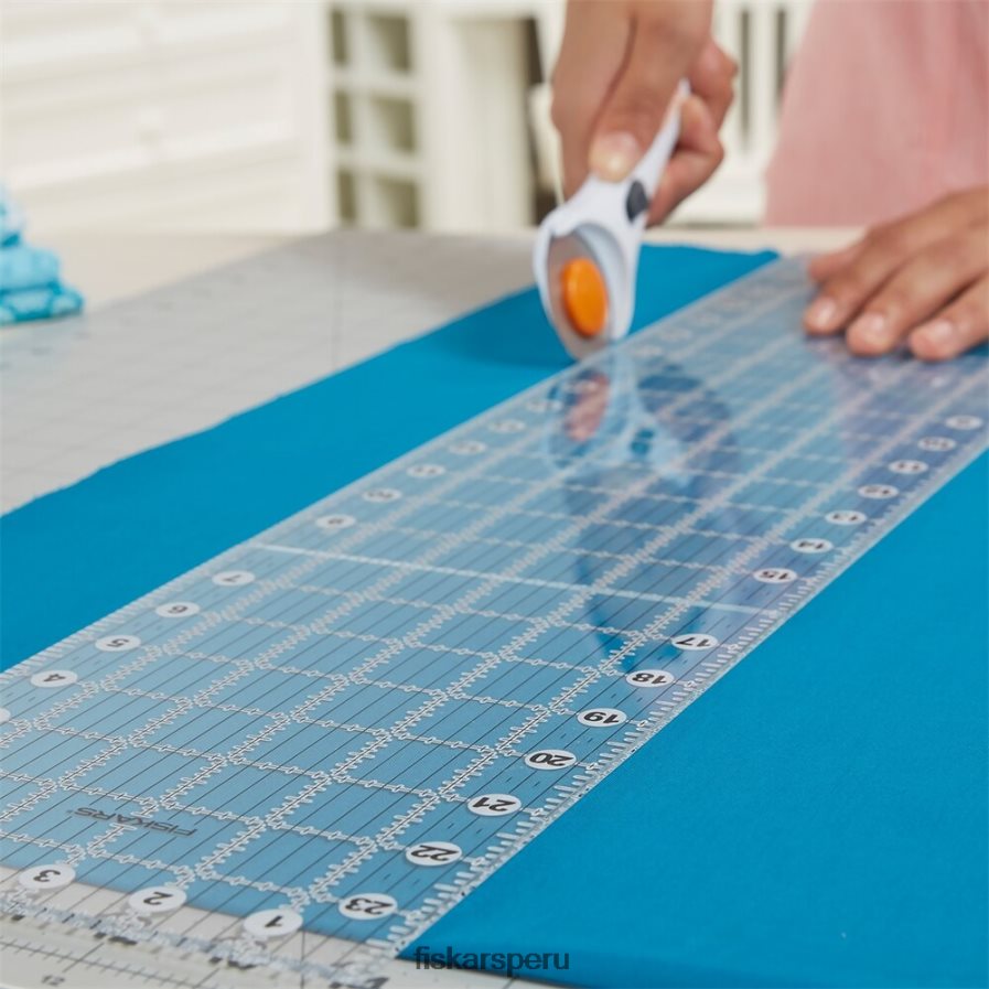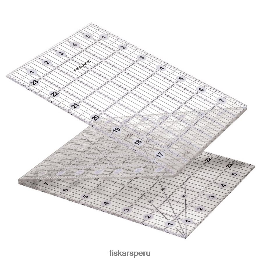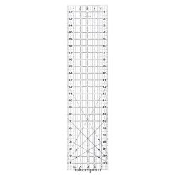 una regla de 6″ x 24″ se pliega a un tercio de su tamaño para obtener una herramienta de medición portátil que le permite realizar cortes largos sin el volumen de una regla normal. un diseño resistente y conveniente facilita el corte de tiras de tela directamente desde el perno, mientras que la posición plegada de la regla de 6″ x 8″ es ideal para cortes más pequeños y almacenamiento. Las bisagras transparentes y duraderas permiten que la regla quede perfectamente plana para realizar cortes suaves sin engancharse ni engancharse. Las líneas presentan intersecciones claras y dos tonos para mejorar la visibilidad en telas claras, oscuras y estampadas. además, las líneas en ángulo de 30, 45 y 60 grados simplifican el corte en ángulo.