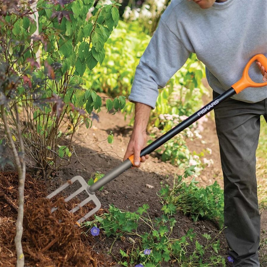 - La horquilla fiskars está construida en acero forjado, lo que la hace ideal para aflojar y levantar tierra, abono, mantillo y otros materiales sueltos